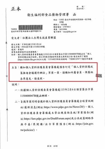 - 2026-03-10 【衛生福利部食品藥物管理署】個人資料保護委員會籌備處預告訂定「個人資料策推進會議運作辦法」草案一案_ FDA器字第1151602108號