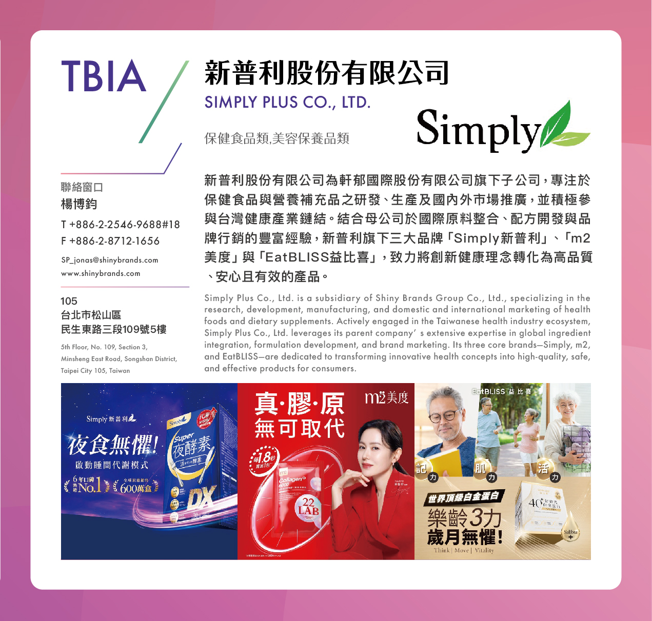 新普利股份有限公司為軒郁國際股份有限公司旗下子公司,專注於保健食品與營養補充品之研發、生產及國內外市場推廣,並積極參與台灣健康產業鏈結。結合母公司於國際原料整合、配方開發與品牌行銷的豐富經驗,新普利旗下三大品牌「Simply新普利」、「m2美度」與「EatBLISS益比喜」,致力將創新健康理念轉化為高品質、安心且有效的產品。