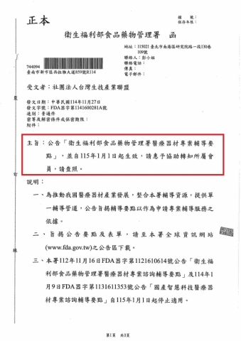 【衛生福利部食品藥物管理署】 FDA器字第1141600281A號_「衛生福利部食品藥物管理署醫療器材專案輔導要點」