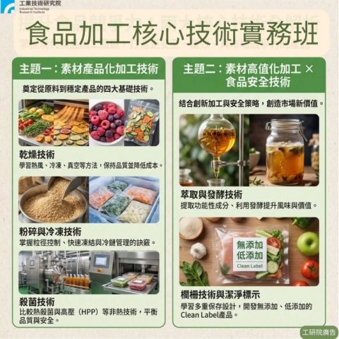 面對快速變化的市場,食品加工企業不只要「能做」,更需要「做得更快、更穩、更省成本」。本課程以企業需求為核心,從素材產品化加工到高值化技術與食品安全逐步建立企業競爭力,協助學員掌握現代食品加工的關鍵技術與產線導入方法。