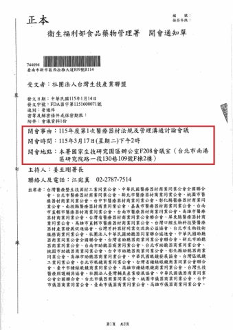開會事由:115年度第1次醫療器材法規及管理溝通討論會議