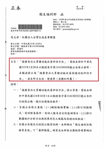 修正「健康食品之胃腸功能改善評估方法」,業經本部於中華民國115年1月20日以衛授食字第1141303438號公告修正發布,名稱並修正為「健康食品之胃腸功能改善保健功效評估方法」,並自即日生效,請查照(並轉知所屬)。