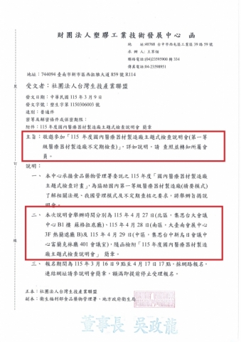 【財團法人塑膠工業技術發展中心】「115年度國內醫療器材製造廠主題式檢查說明會(第一等級醫療器材製造廠不定期檢查)」_ 塑生字第1150306003號