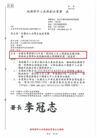 有關本署辦理115年度「第29屆小巨人獎選拔表揚活動」,請協助宣傳周知並鼓勵相關企業踴躍參選,請查照。