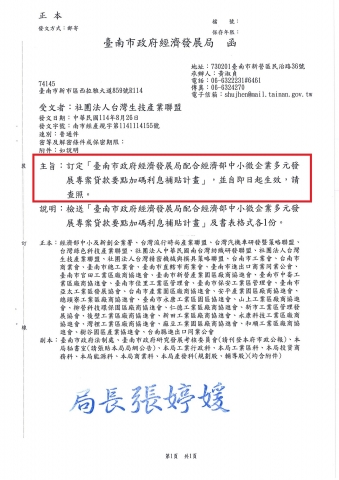 【臺南市政府經濟發展局】 南市經產規字第1141114155號_「臺南市政府經濟發展局配合經濟部中小微企業多元發展專案貸款要點加碼利息系補貼計畫」