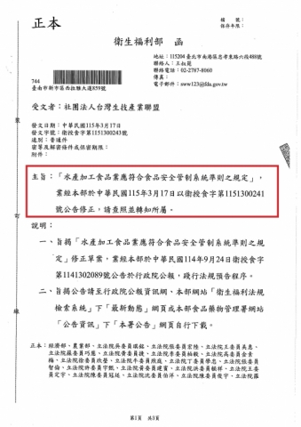 - 2026-03-19 【衛生福利部】「水產加工食品業應符合食品安全管制系統准則之規定」_衛授食字第1151300241號
