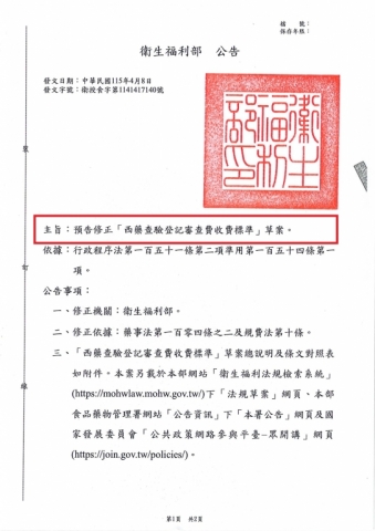 - 2026-04-09 【衛生福利部】預告修正「西藥查驗登記審查費收費標準」草案_ 衛授食字第1141417140號