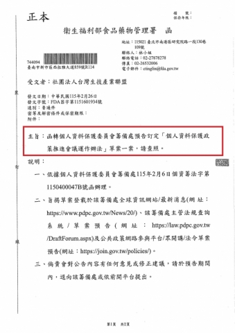 【衛生福利部食品藥物管理署】預告訂定「個人資料保護政策推進會議運作辦法」草案_ FDA器字第1151601934號
