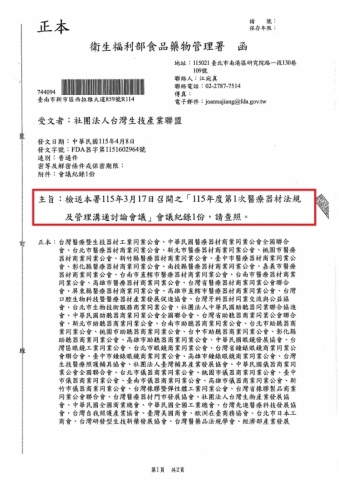 【衛生福利部食品藥物管理署】「115年度第1次醫療器材法規及管理溝通討論會議」會議紀錄1份_FDA器字第1151602964號