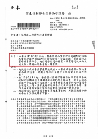 本署自115年5月1日起,醫療器材品質管理系統(QMS/QSD)及優良運銷準則(GDP)符合性檢查,全面透過「醫療器材品質管理申請平台」施行電子化送件作業,毋需寄送紙本函文或文件,請轉知所屬會員,請查照。