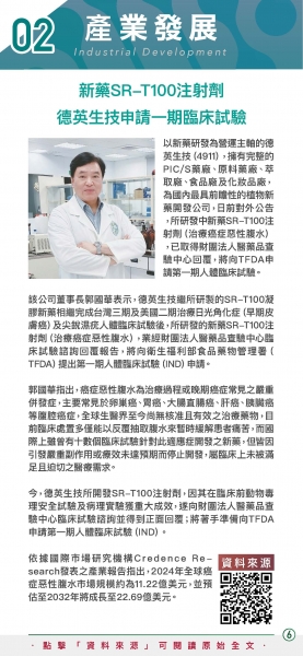 以新藥研發為營運主軸的德英生技(4911),擁有完整的PIC/S藥廠、原料藥廠、萃取廠、食品廠及化妝品廠,為國內最具前瞻性的植物新藥開發公司,日前對外公告,所研發中新藥SR-T100注射劑(治療癌症惡性腹水),已取得財團法人醫藥品查驗中心回覆,將向TFDA申請第一期人體臨床試驗。